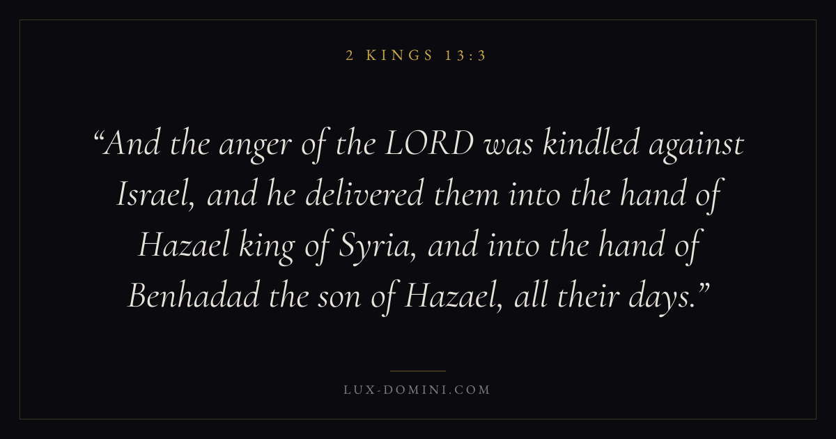 And the anger of the LORD was kindled against Israel, and he delivered them into the hand of Hazael king of Syria, and into the hand of Benhadad the son of Hazael, all their days.