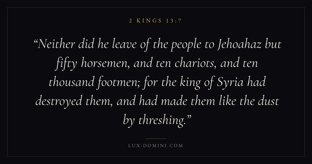 Neither did he leave of the people to Jehoahaz but fifty horsemen, and ten chariots, and ten thousand footmen; for the king of Syria had destroyed them, and had made them like the dust by threshing.