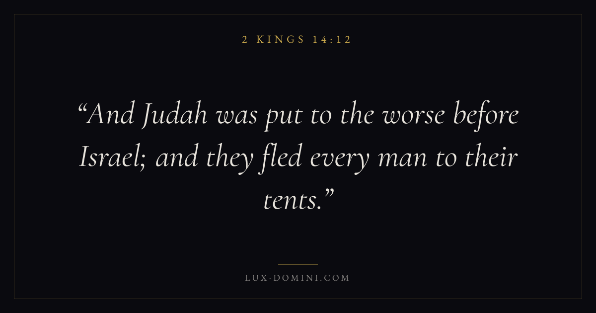 Books / 2 Kings / Chapter 14 / Verse 12 ← 2 Kings 14:11 2 Kings 14:12 2 Kings 14:13 → And Judah was put to the worse before Israel; and they fled every man to their tents. Download verse card Share on Twitter Share on Facebook Pin it ✦ Key themes HopeJustice and mercyTruthProphetic witness Read with 2 Kings 14:102 Kings 14:11Romans 8:24Revelation 21:4 Related topics Bible verses about hopeBible verses about justice and mercyBible verses about truth ✦ 2 Kings Chapter 14 verses V. 1 V. 2 V. 3 V. 4 V. 5 V. 6 V. 7 V. 8 V. 9 V. 10 V. 11 V. 12 V. 13 V. 14 V. 15 V. 16 V. 17 V. 18 V. 19 V. 20 V. 21 V. 22 V. 23 V. 24 V. 25 V. 26 V. 27 V. 28 V. 29
