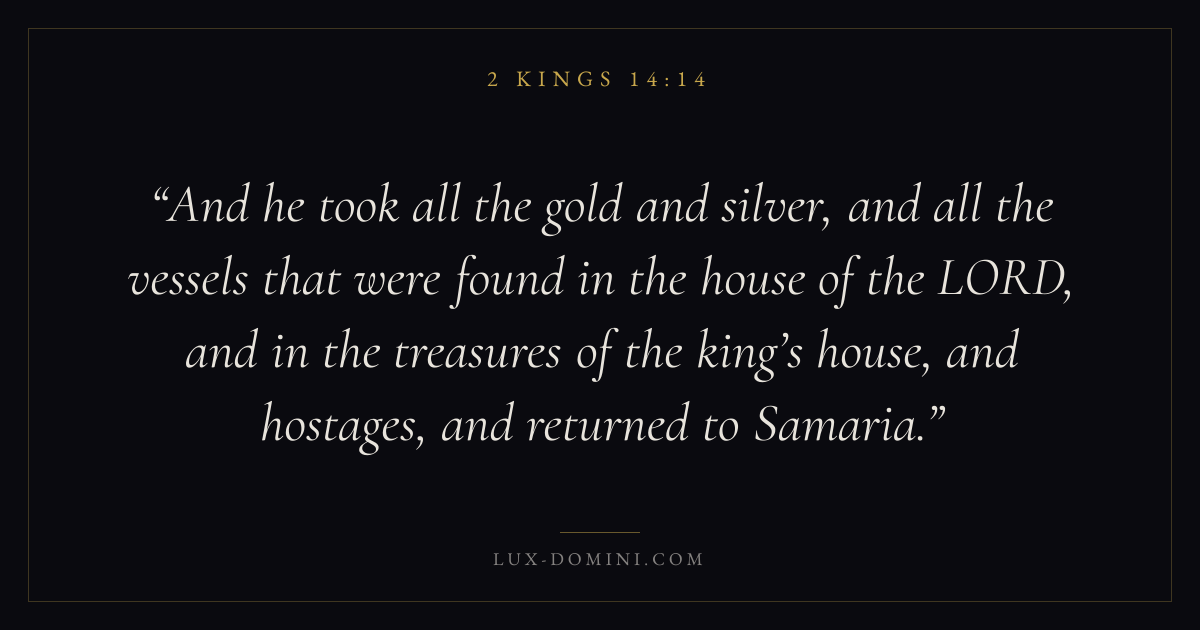 And he took all the gold and silver, and all the vessels that were found in the house of the LORD, and in the treasures of the king’s house, and hostages, and returned to Samaria.