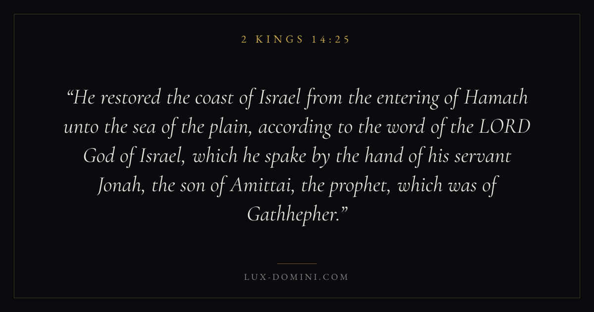 He restored the coast of Israel from the entering of Hamath unto the sea of the plain, according to the word of the LORD God of Israel, which he spake by the hand of his servant Jonah, the son of Amittai, the prophet, which was of Gathhepher.