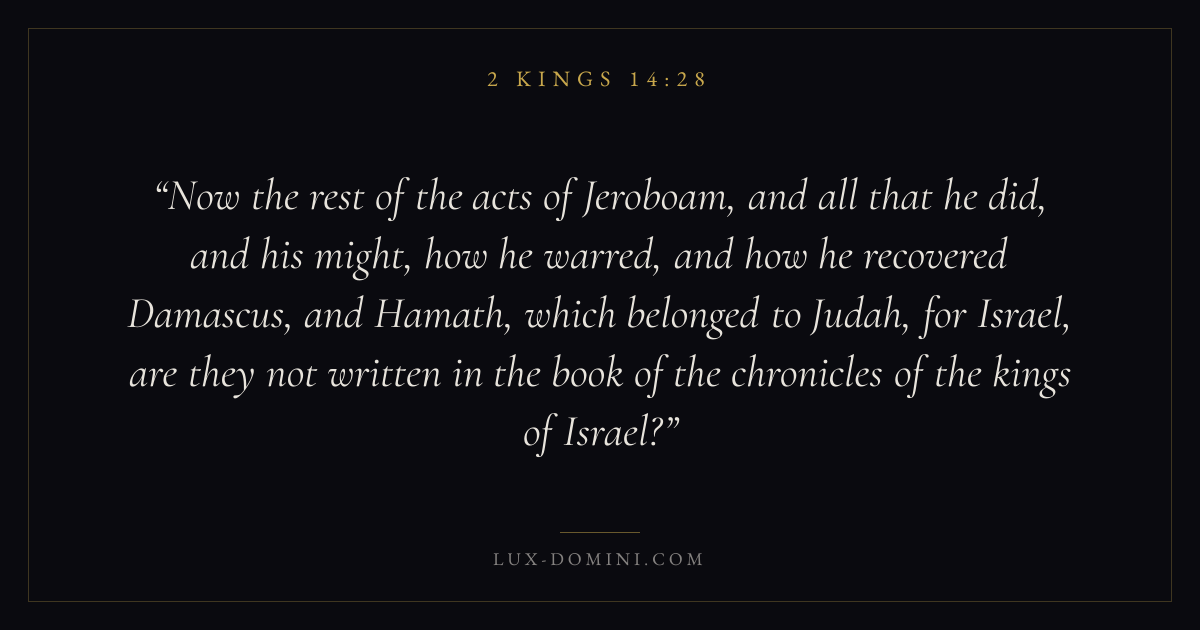 Now the rest of the acts of Jeroboam, and all that he did, and his might, how he warred, and how he recovered Damascus, and Hamath, which belonged to Judah, for Israel, are they not written in the book of the chronicles of the kings of Israel?