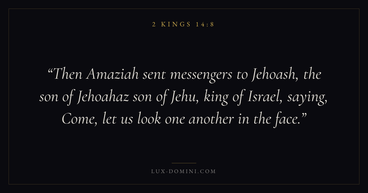 Then Amaziah sent messengers to Jehoash, the son of Jehoahaz son of Jehu, king of Israel, saying, Come, let us look one another in the face.
