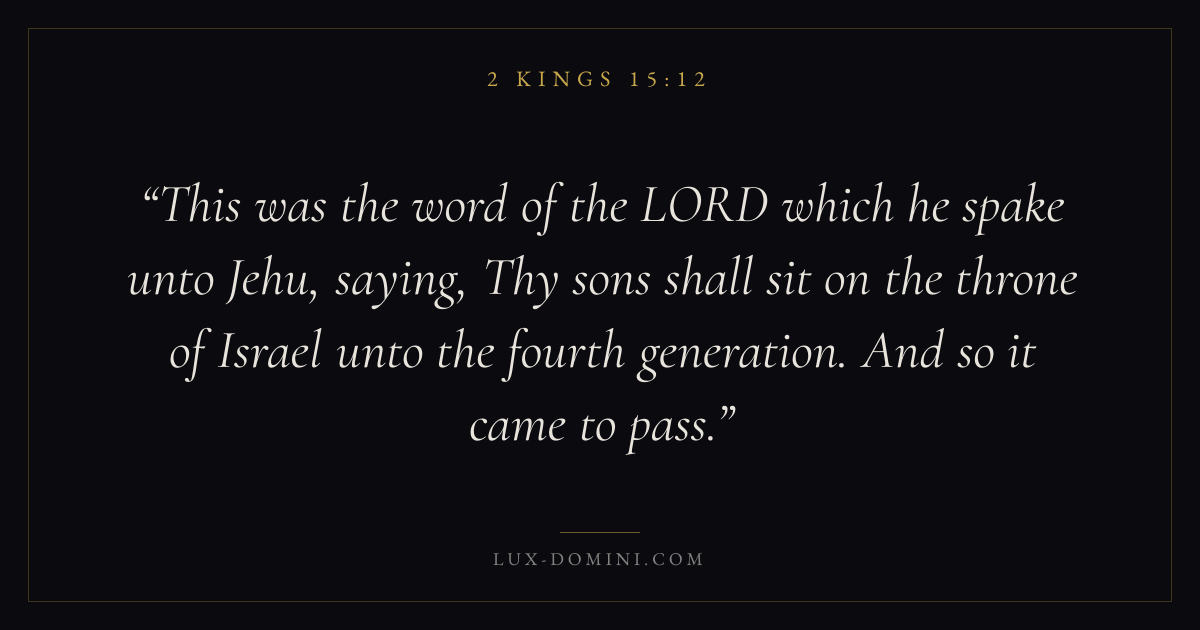 This was the word of the LORD which he spake unto Jehu, saying, Thy sons shall sit on the throne of Israel unto the fourth generation. And so it came to pass.