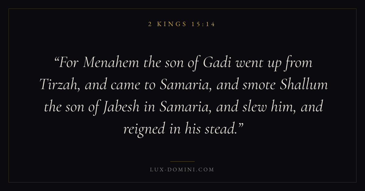 For Menahem the son of Gadi went up from Tirzah, and came to Samaria, and smote Shallum the son of Jabesh in Samaria, and slew him, and reigned in his stead.