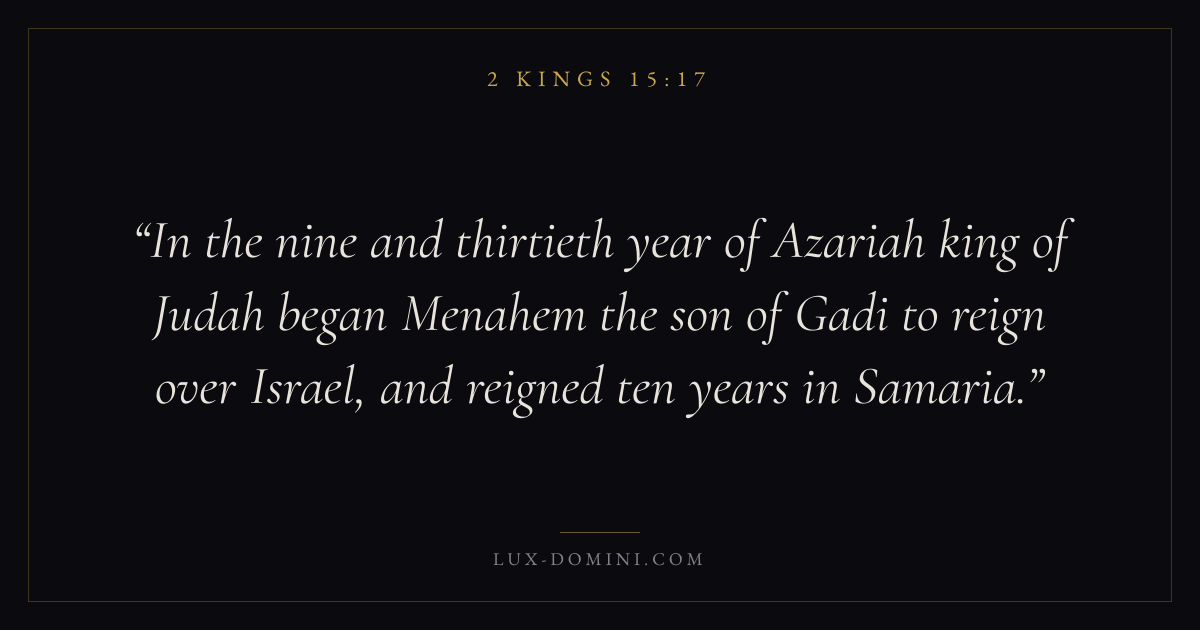 In the nine and thirtieth year of Azariah king of Judah began Menahem the son of Gadi to reign over Israel, and reigned ten years in Samaria.
