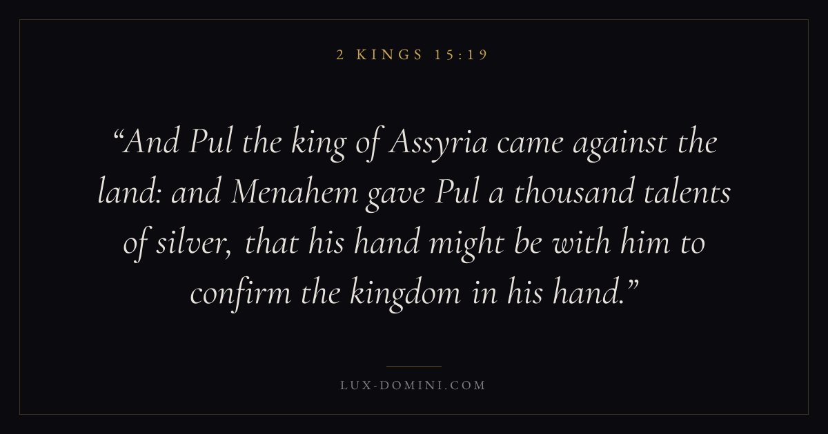 And Pul the king of Assyria came against the land: and Menahem gave Pul a thousand talents of silver, that his hand might be with him to confirm the kingdom in his hand.