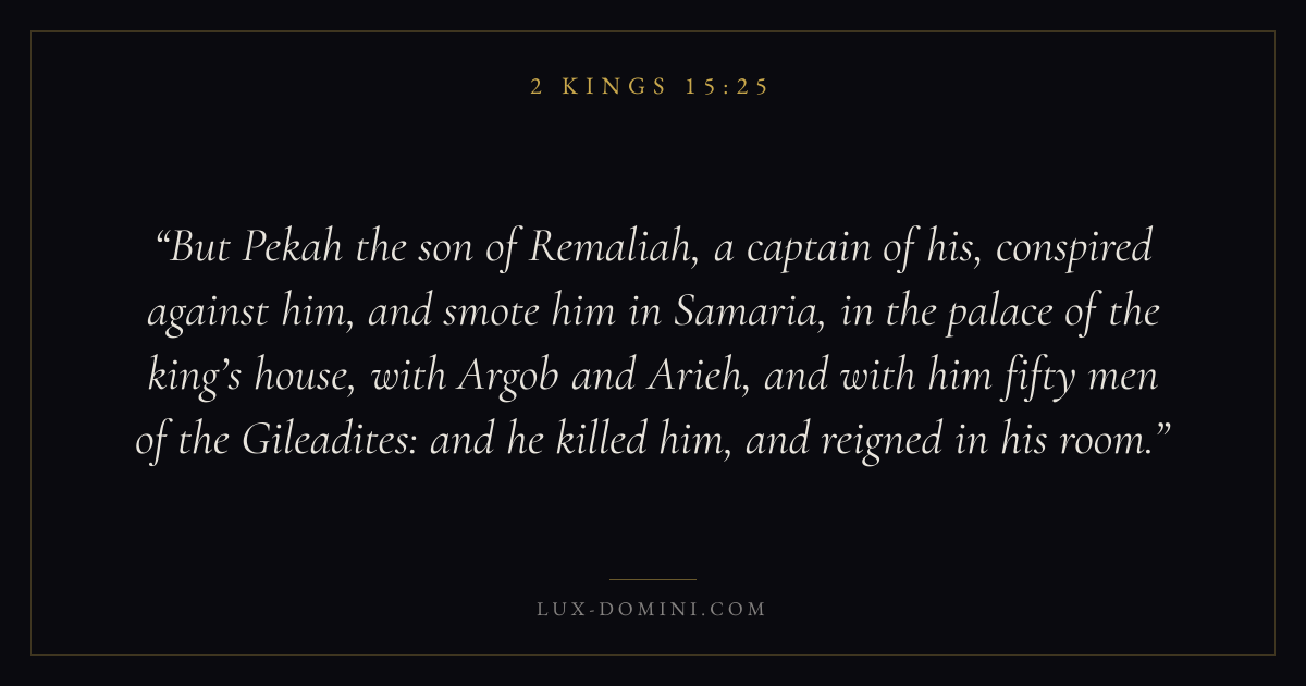 But Pekah the son of Remaliah, a captain of his, conspired against him, and smote him in Samaria, in the palace of the king’s house, with Argob and Arieh, and with him fifty men of the Gileadites: and he killed him, and reigned in his room.