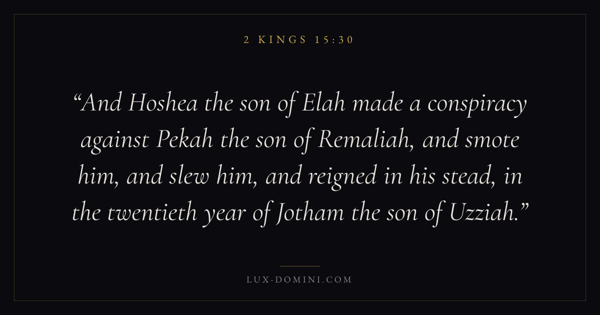 And Hoshea the son of Elah made a conspiracy against Pekah the son of Remaliah, and smote him, and slew him, and reigned in his stead, in the twentieth year of Jotham the son of Uzziah.
