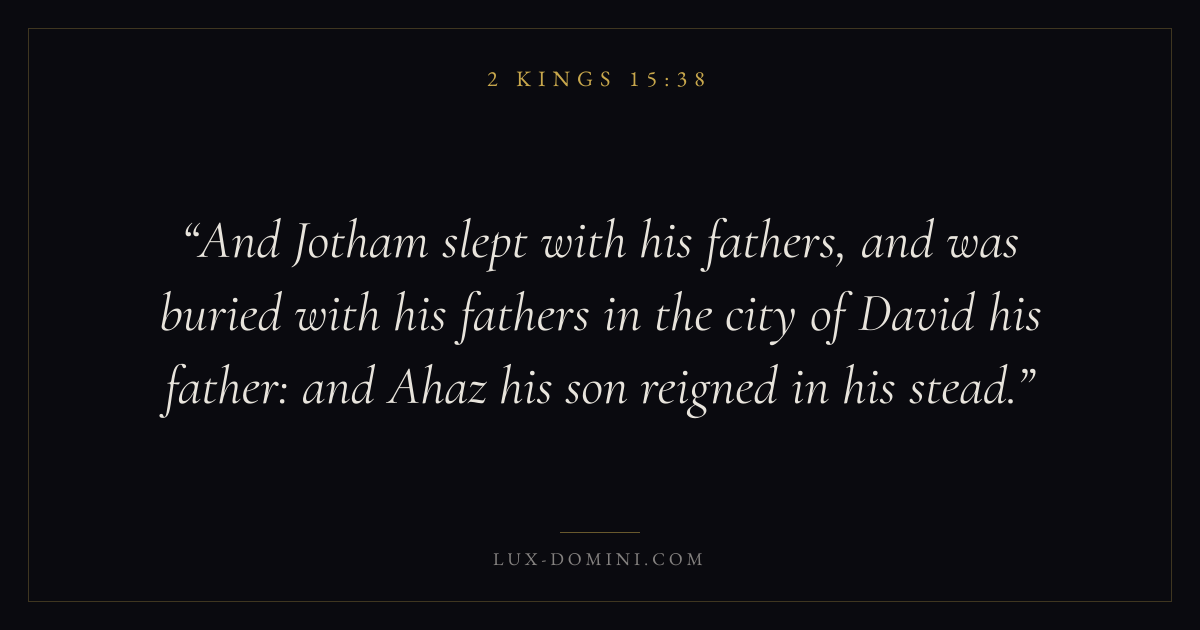 And Jotham slept with his fathers, and was buried with his fathers in the city of David his father: and Ahaz his son reigned in his stead.