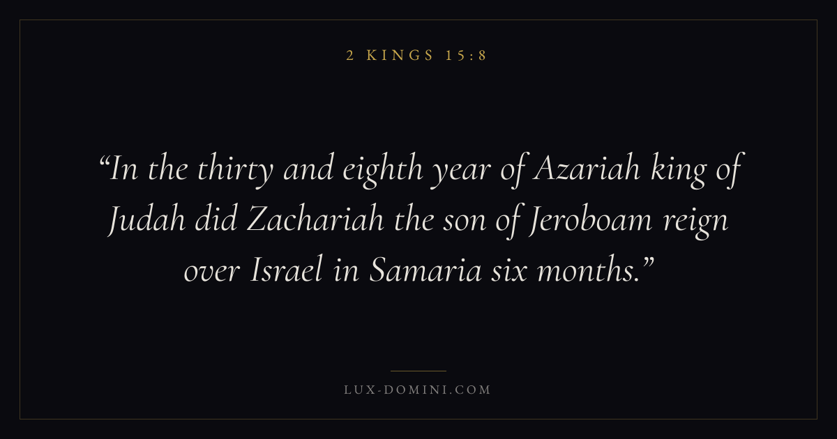 In the thirty and eighth year of Azariah king of Judah did Zachariah the son of Jeroboam reign over Israel in Samaria six months.