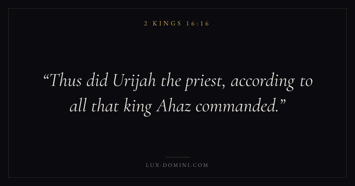 Books / 2 Kings / Chapter 16 / Verse 16 ← 2 Kings 16:15 2 Kings 16:16 2 Kings 16:17 → Thus did Urijah the priest, according to all that king Ahaz commanded. Download verse card Share on Twitter Share on Facebook Pin it ✦ Key themes HopeJustice and mercyTruthProphetic witness Read with 2 Kings 16:15Romans 8:24Revelation 21:4Micah 6:8 Related topics Bible verses about hopeBible verses about justice and mercyBible verses about truth ✦ 2 Kings Chapter 16 verses V. 1 V. 2 V. 3 V. 4 V. 5 V. 6 V. 7 V. 8 V. 9 V. 10 V. 11 V. 12 V. 13 V. 14 V. 15 V. 16 V. 17 V. 18 V. 19 V. 20