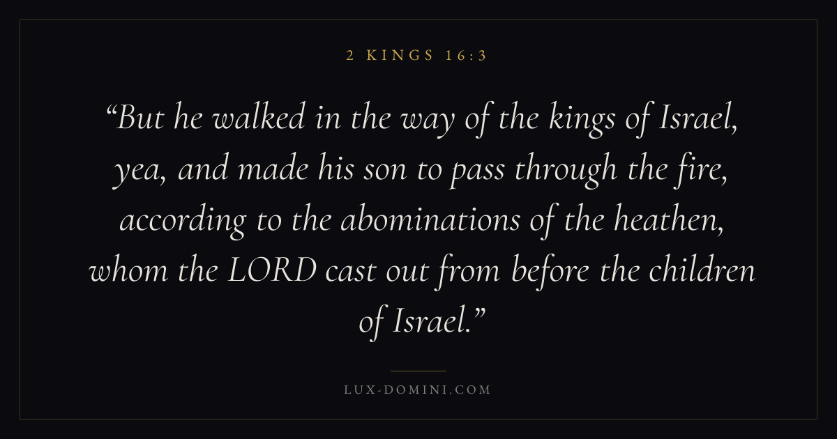 But he walked in the way of the kings of Israel, yea, and made his son to pass through the fire, according to the abominations of the heathen, whom the LORD cast out from before the children of Israel.