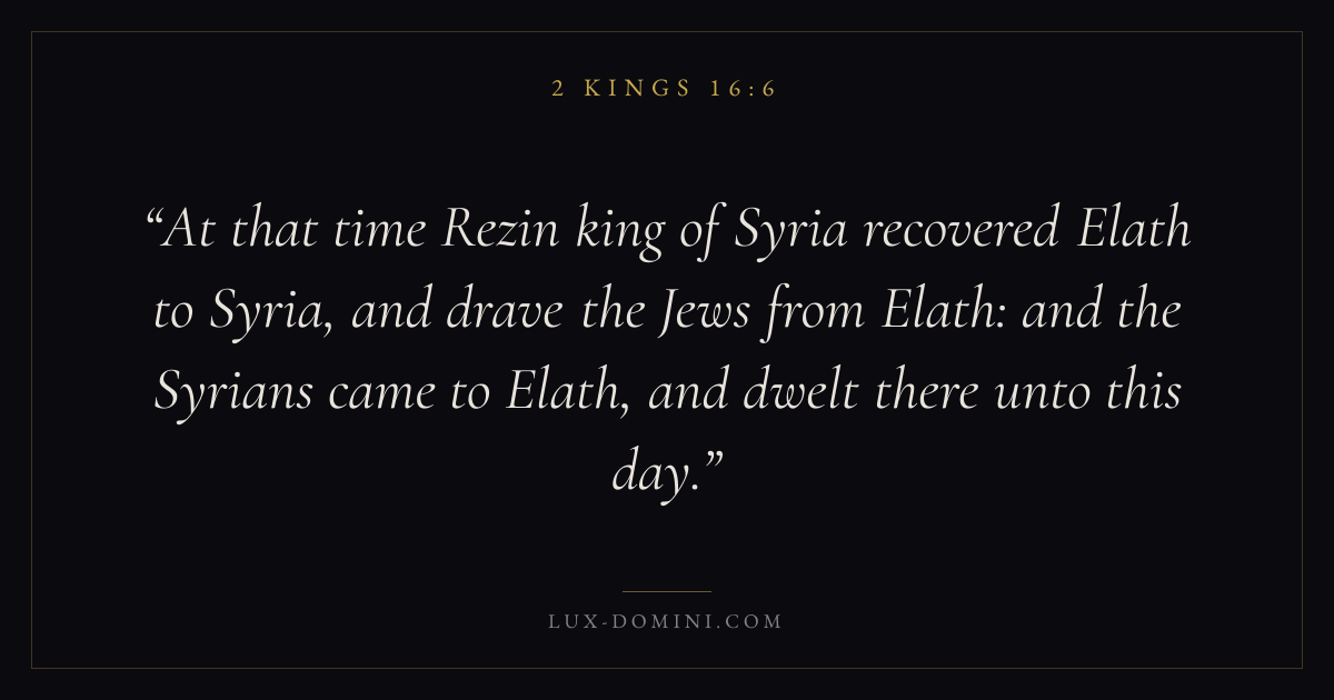 At that time Rezin king of Syria recovered Elath to Syria, and drave the Jews from Elath: and the Syrians came to Elath, and dwelt there unto this day.