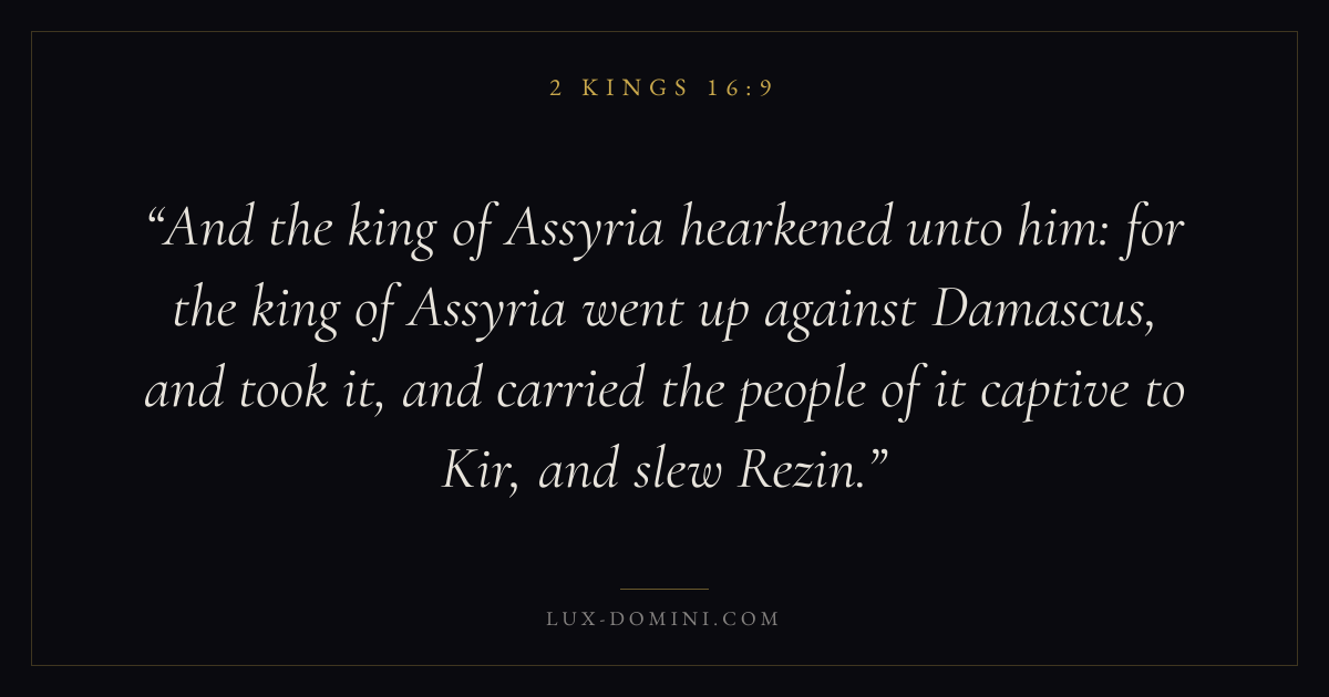 And the king of Assyria hearkened unto him: for the king of Assyria went up against Damascus, and took it, and carried the people of it captive to Kir, and slew Rezin.