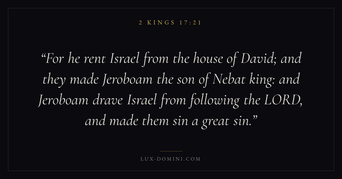 For he rent Israel from the house of David; and they made Jeroboam the son of Nebat king: and Jeroboam drave Israel from following the LORD, and made them sin a great sin.
