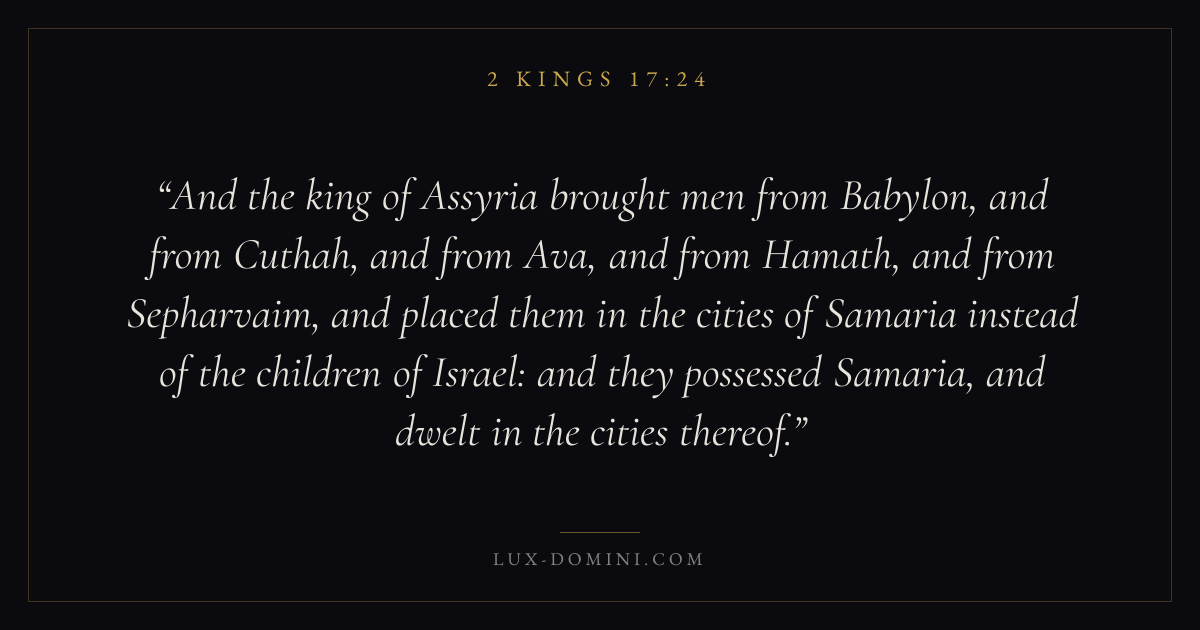 And the king of Assyria brought men from Babylon, and from Cuthah, and from Ava, and from Hamath, and from Sepharvaim, and placed them in the cities of Samaria instead of the children of Israel: and they possessed Samaria, and dwelt in the cities thereof.