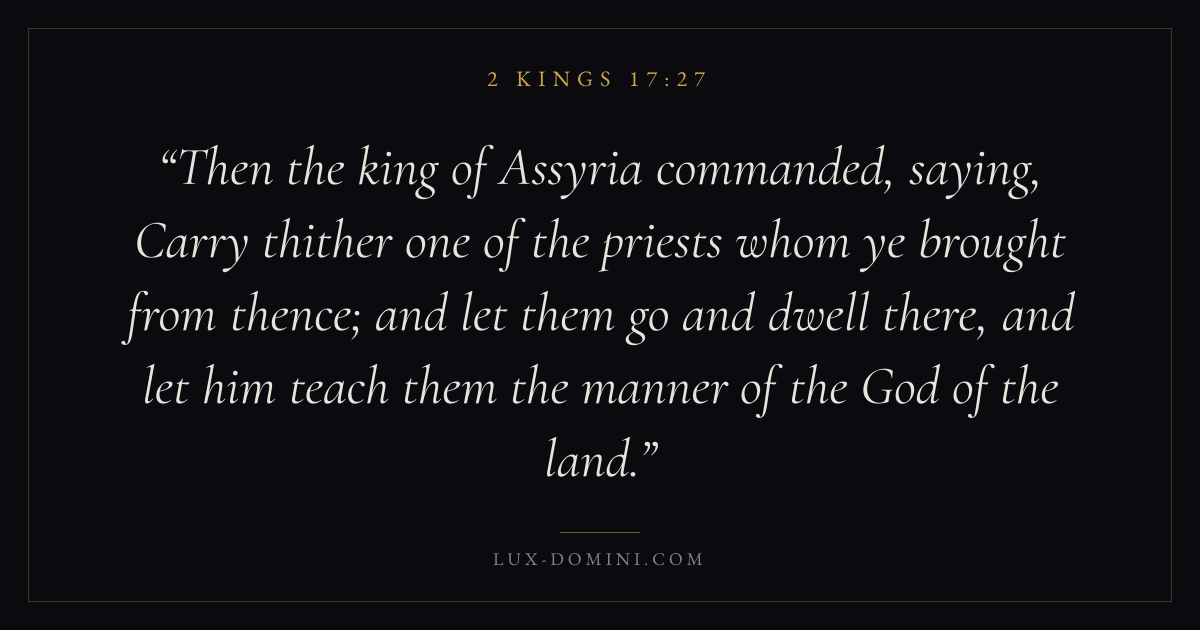 Then the king of Assyria commanded, saying, Carry thither one of the priests whom ye brought from thence; and let them go and dwell there, and let him teach them the manner of the God of the land.