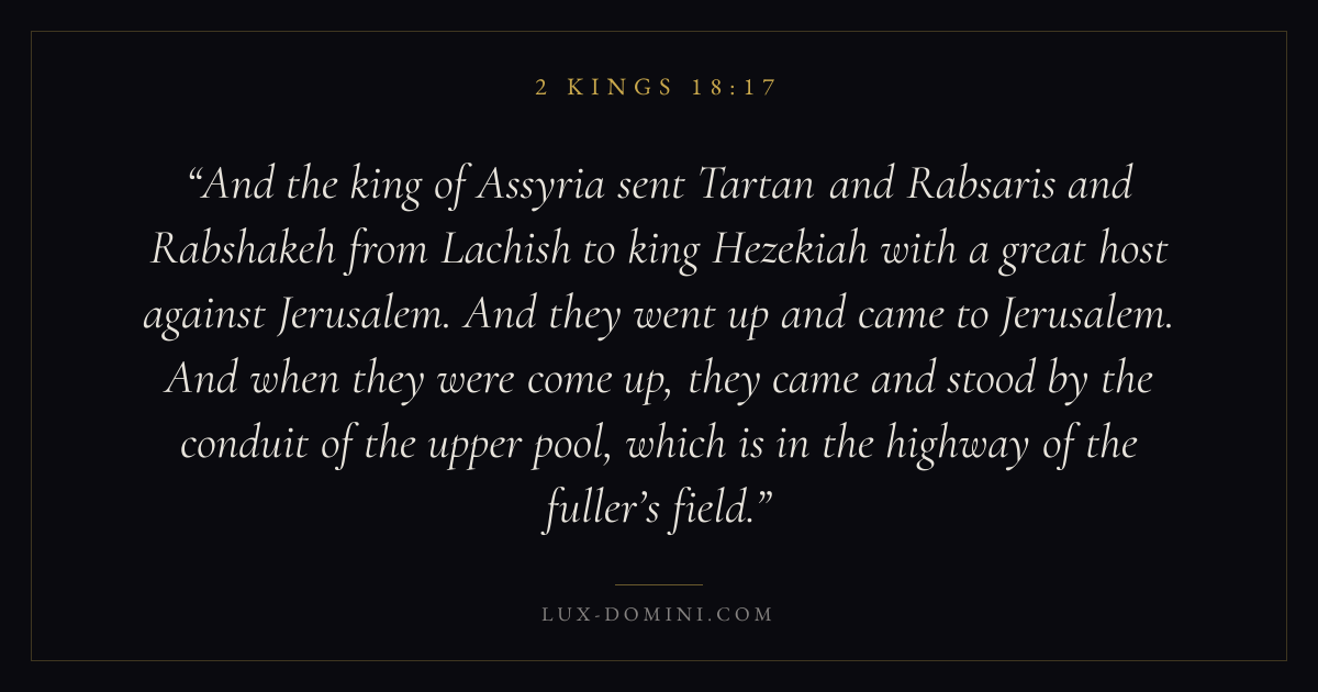 And the king of Assyria sent Tartan and Rabsaris and Rabshakeh from Lachish to king Hezekiah with a great host against Jerusalem. And they went up and came to Jerusalem. And when they were come up, they came and stood by the conduit of the upper pool, which is in the highway of the fuller’s field.