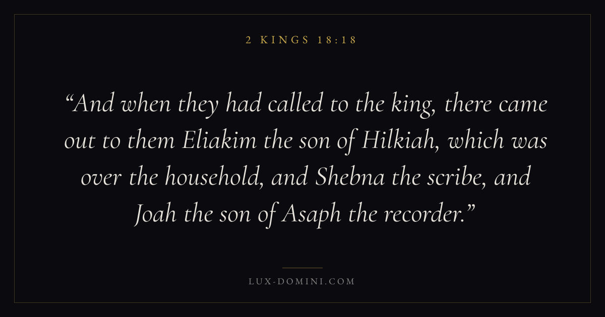 And when they had called to the king, there came out to them Eliakim the son of Hilkiah, which was over the household, and Shebna the scribe, and Joah the son of Asaph the recorder.