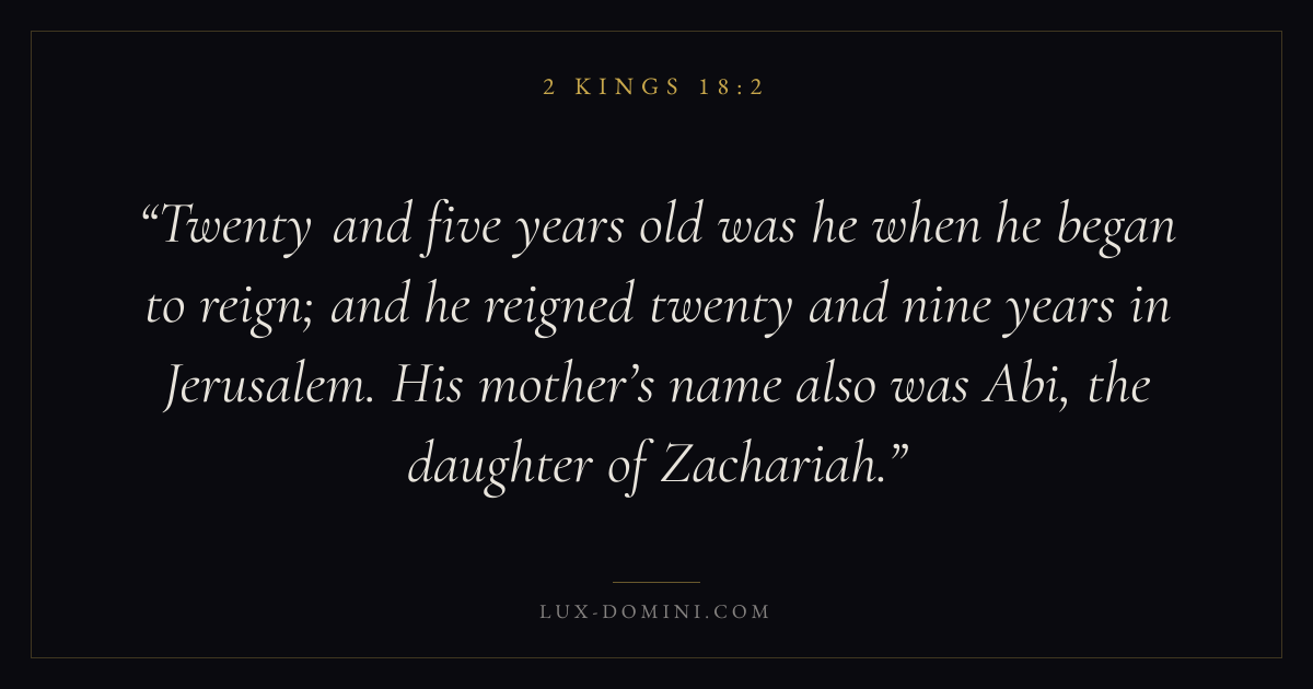 Twenty and five years old was he when he began to reign; and he reigned twenty and nine years in Jerusalem. His mother’s name also was Abi, the daughter of Zachariah.