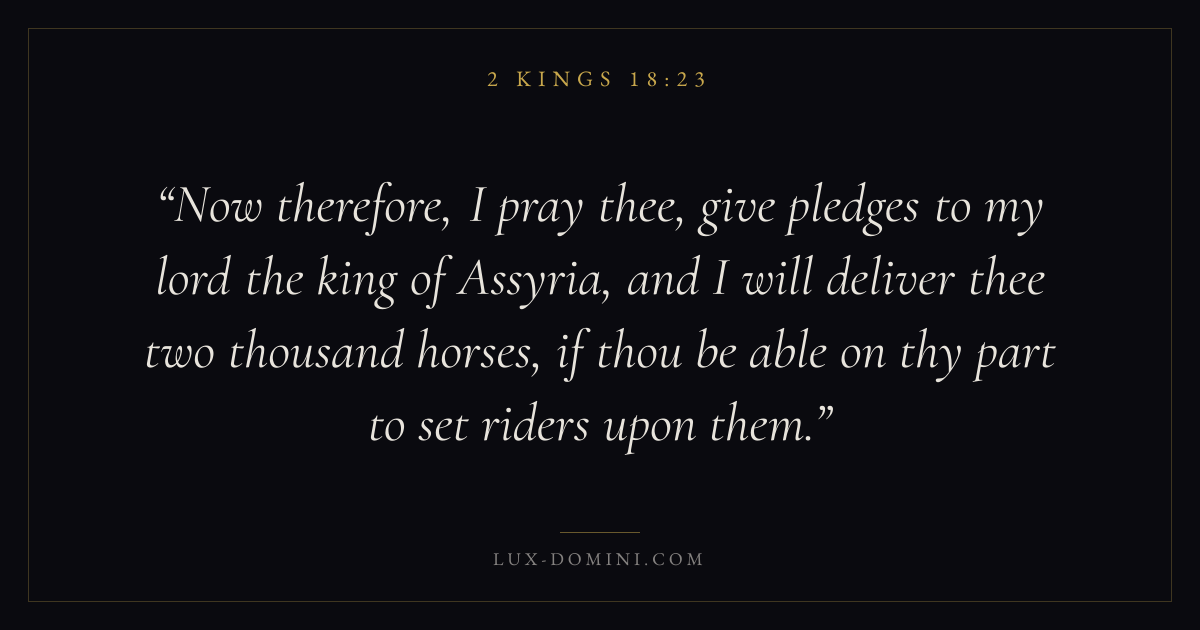 Now therefore, I pray thee, give pledges to my lord the king of Assyria, and I will deliver thee two thousand horses, if thou be able on thy part to set riders upon them.