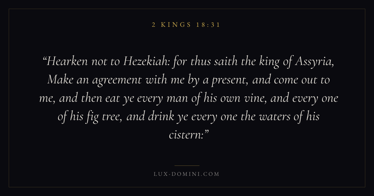 Hearken not to Hezekiah: for thus saith the king of Assyria, Make an agreement with me by a present, and come out to me, and then eat ye every man of his own vine, and every one of his fig tree, and drink ye every one the waters of his cistern: