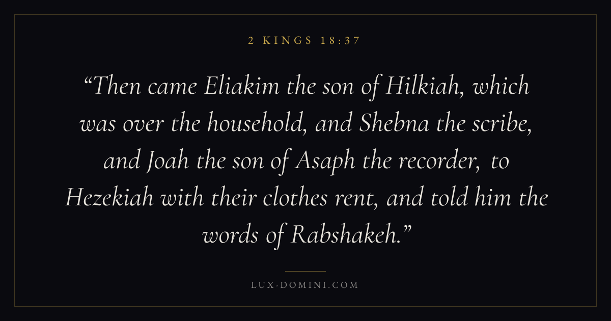 Then came Eliakim the son of Hilkiah, which was over the household, and Shebna the scribe, and Joah the son of Asaph the recorder, to Hezekiah with their clothes rent, and told him the words of Rabshakeh.