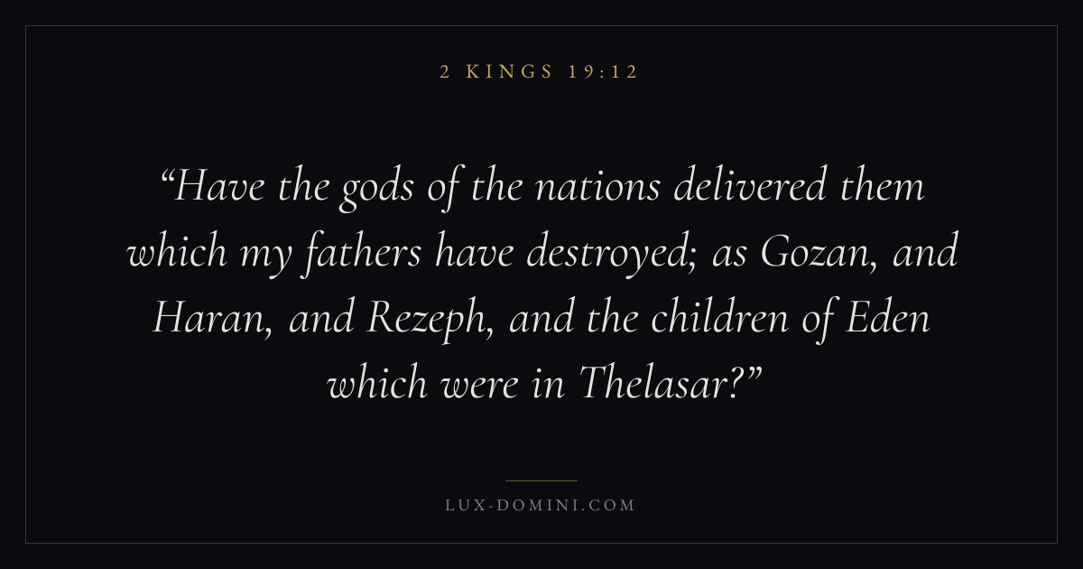 Have the gods of the nations delivered them which my fathers have destroyed; as Gozan, and Haran, and Rezeph, and the children of Eden which were in Thelasar?