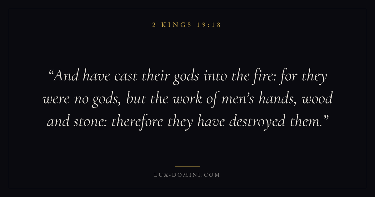 And have cast their gods into the fire: for they were no gods, but the work of men’s hands, wood and stone: therefore they have destroyed them.