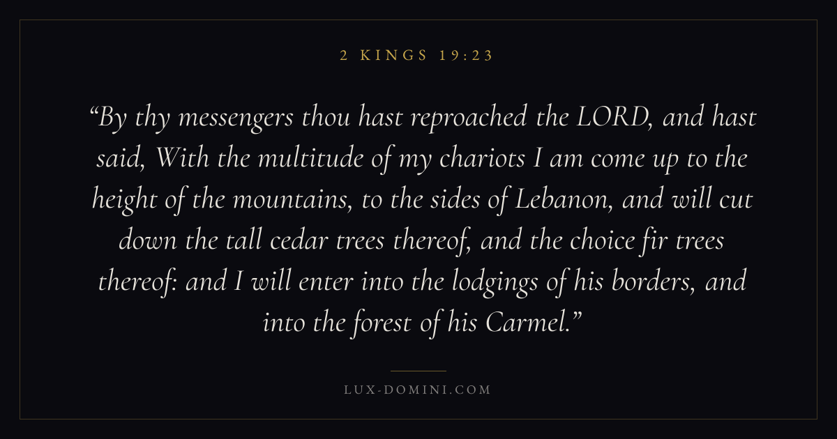 By thy messengers thou hast reproached the LORD, and hast said, With the multitude of my chariots I am come up to the height of the mountains, to the sides of Lebanon, and will cut down the tall cedar trees thereof, and the choice fir trees thereof: and I will enter into the lodgings of his borders, and into the forest of his Carmel.