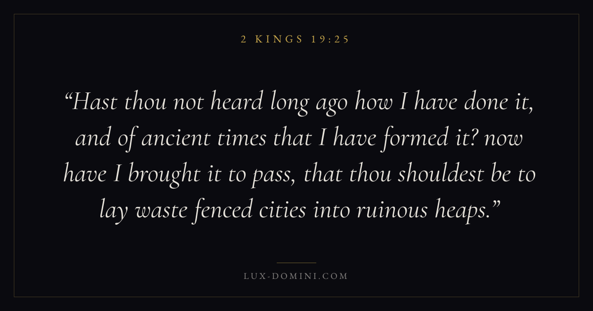 Hast thou not heard long ago how I have done it, and of ancient times that I have formed it? now have I brought it to pass, that thou shouldest be to lay waste fenced cities into ruinous heaps.