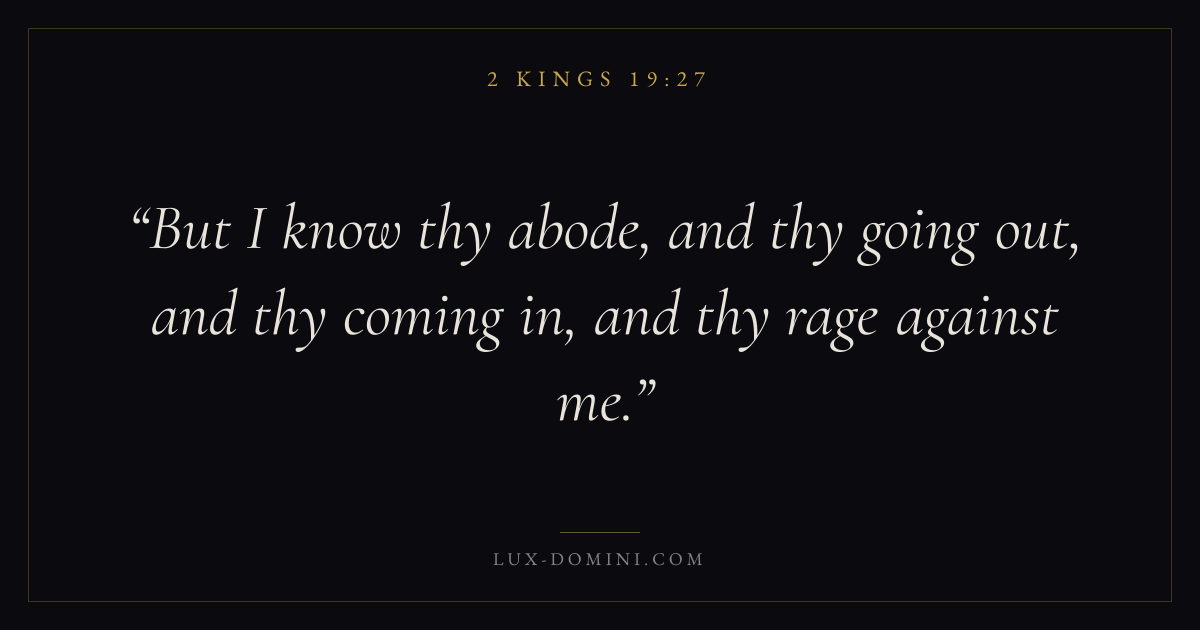 Books / 2 Kings / Chapter 19 / Verse 27 ← 2 Kings 19:26 2 Kings 19:27 2 Kings 19:28 → But I know thy abode, and thy going out, and thy coming in, and thy rage against me. Download verse card Share on Twitter Share on Facebook Pin it ✦ Key themes HopeJustice and mercyTruthProphetic witness Read with 2 Kings 19:252 Kings 19:26Romans 8:24Revelation 21:4 Related topics Bible verses about hopeBible verses about justice and mercyBible verses about truth ✦ 2 Kings Chapter 19 verses V. 1 V. 2 V. 3 V. 4 V. 5 V. 6 V. 7 V. 8 V. 9 V. 10 V. 11 V. 12 V. 13 V. 14 V. 15 V. 16 V. 17 V. 18 V. 19 V. 20 V. 21 V. 22 V. 23 V. 24 V. 25 V. 26 V. 27 V. 28 V. 29 V. 30 V. 31 V. 32 V. 33 V. 34 V. 35 V. 36 V. 37