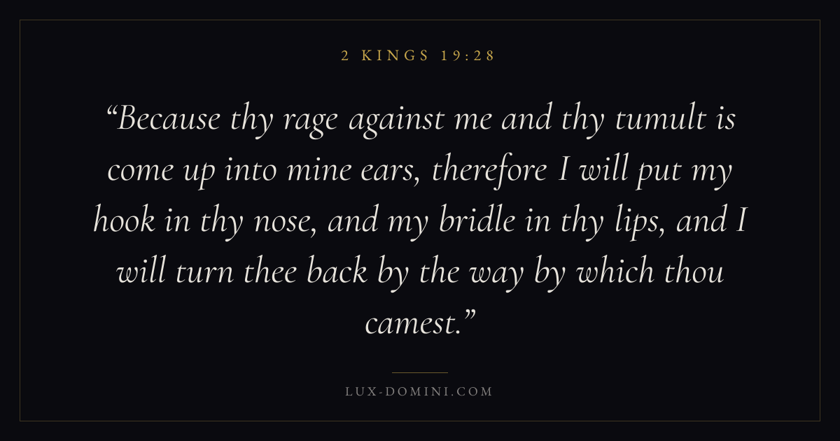 Because thy rage against me and thy tumult is come up into mine ears, therefore I will put my hook in thy nose, and my bridle in thy lips, and I will turn thee back by the way by which thou camest.