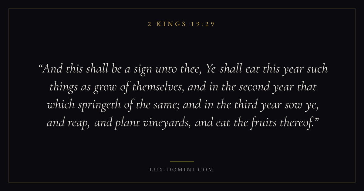 And this shall be a sign unto thee, Ye shall eat this year such things as grow of themselves, and in the second year that which springeth of the same; and in the third year sow ye, and reap, and plant vineyards, and eat the fruits thereof.