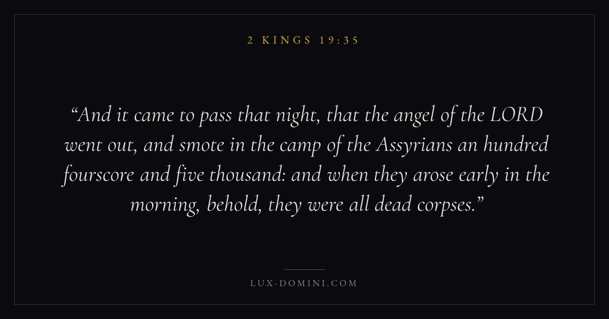 And it came to pass that night, that the angel of the LORD went out, and smote in the camp of the Assyrians an hundred fourscore and five thousand: and when they arose early in the morning, behold, they were all dead corpses.