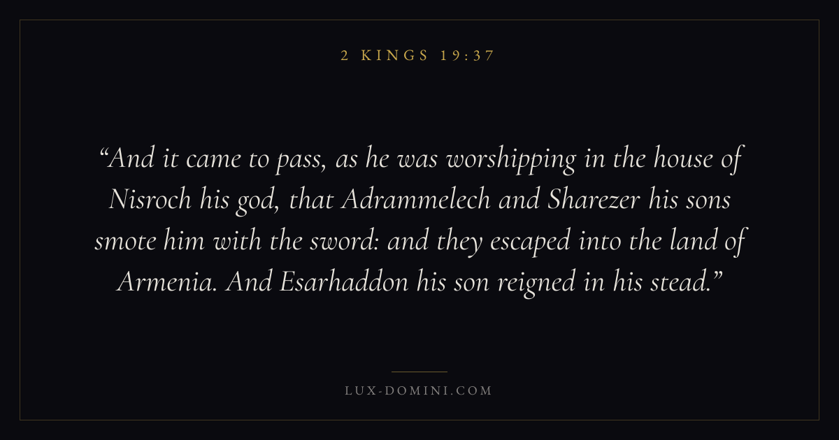 And it came to pass, as he was worshipping in the house of Nisroch his god, that Adrammelech and Sharezer his sons smote him with the sword: and they escaped into the land of Armenia. And Esarhaddon his son reigned in his stead.