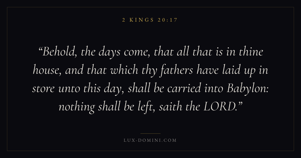 Behold, the days come, that all that is in thine house, and that which thy fathers have laid up in store unto this day, shall be carried into Babylon: nothing shall be left, saith the LORD.