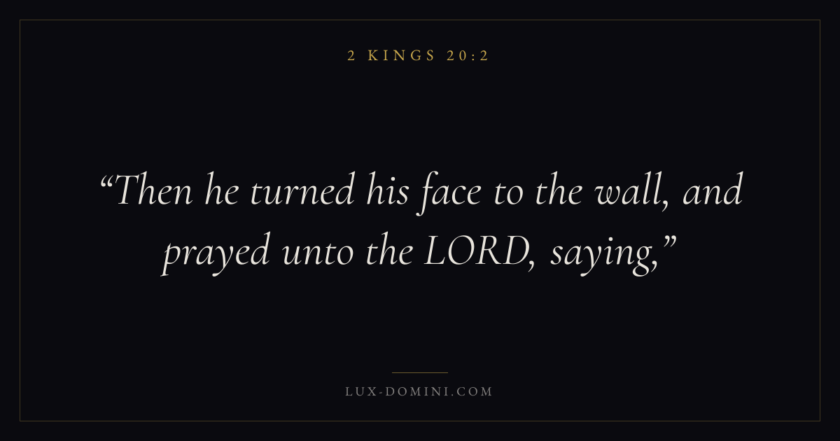 Books / 2 Kings / Chapter 20 / Verse 2 ← 2 Kings 20:1 2 Kings 20:2 2 Kings 20:3 → Then he turned his face to the wall, and prayed unto the LORD, saying, Download verse card Share on Twitter Share on Facebook Pin it ✦ Key themes HopeJustice and mercyTruthProphetic witness Read with 2 Kings 20:12 Kings 20:3Romans 8:24Revelation 21:4 Related topics Bible verses about hopeBible verses about justice and mercyBible verses about truth ✦ 2 Kings Chapter 20 verses V. 1 V. 2 V. 3 V. 4 V. 5 V. 6 V. 7 V. 8 V. 9 V. 10 V. 11 V. 12 V. 13 V. 14 V. 15 V. 16 V. 17 V. 18 V. 19 V. 20 V. 21