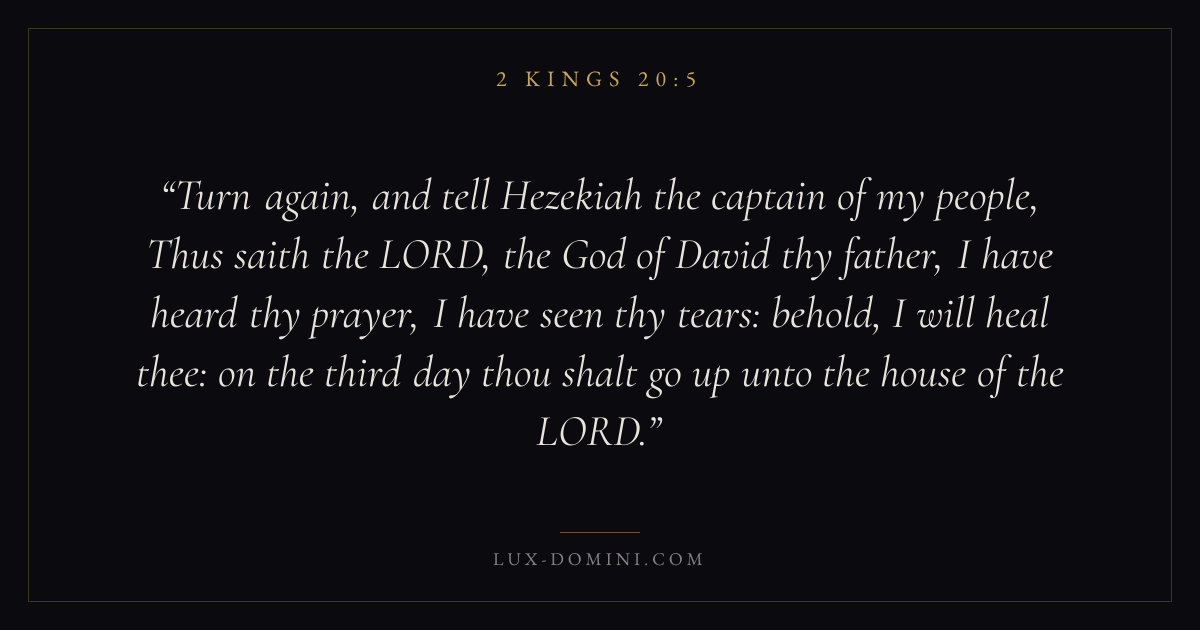 Turn again, and tell Hezekiah the captain of my people, Thus saith the LORD, the God of David thy father, I have heard thy prayer, I have seen thy tears: behold, I will heal thee: on the third day thou shalt go up unto the house of the LORD.