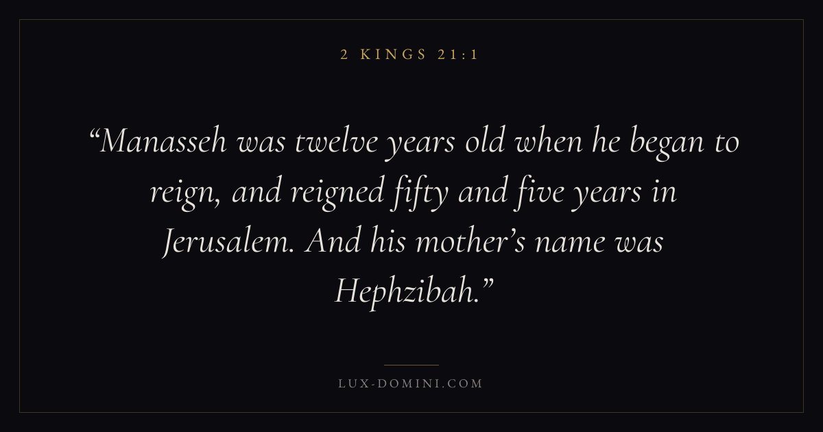 Manasseh was twelve years old when he began to reign, and reigned fifty and five years in Jerusalem. And his mother’s name was Hephzibah.