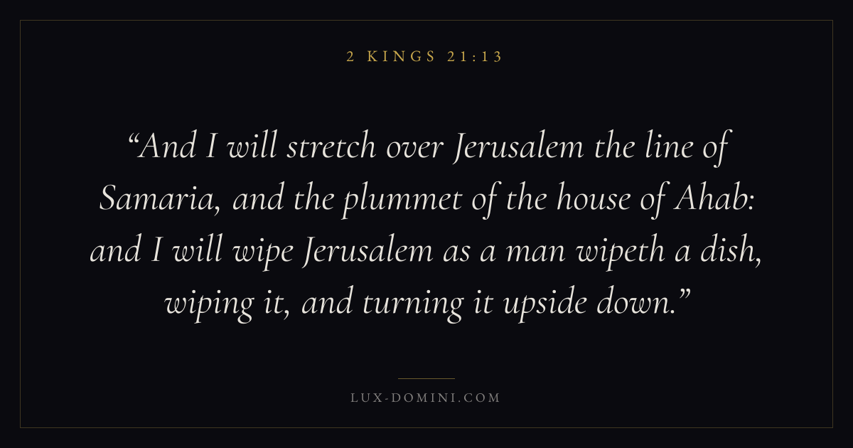 And I will stretch over Jerusalem the line of Samaria, and the plummet of the house of Ahab: and I will wipe Jerusalem as a man wipeth a dish, wiping it, and turning it upside down.