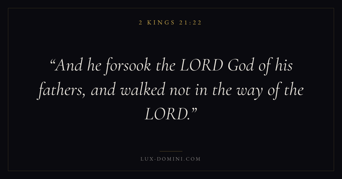 Books / 2 Kings / Chapter 21 / Verse 22 ← 2 Kings 21:21 2 Kings 21:22 2 Kings 21:23 → And he forsook the LORD God of his fathers, and walked not in the way of the LORD. Download verse card Share on Twitter Share on Facebook Pin it ✦ Key themes HopeJustice and mercyTruthProphetic witness Read with 2 Kings 21:192 Kings 21:20Romans 8:24Revelation 21:4 Related topics Bible verses about hopeBible verses about justice and mercyBible verses about truth ✦ 2 Kings Chapter 21 verses V. 1 V. 2 V. 3 V. 4 V. 5 V. 6 V. 7 V. 8 V. 9 V. 10 V. 11 V. 12 V. 13 V. 14 V. 15 V. 16 V. 17 V. 18 V. 19 V. 20 V. 21 V. 22 V. 23 V. 24 V. 25 V. 26