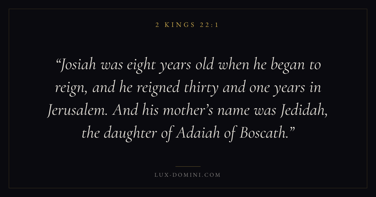 Josiah was eight years old when he began to reign, and he reigned thirty and one years in Jerusalem. And his mother’s name was Jedidah, the daughter of Adaiah of Boscath.
