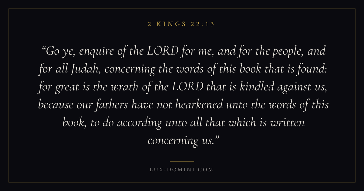 Go ye, enquire of the LORD for me, and for the people, and for all Judah, concerning the words of this book that is found: for great is the wrath of the LORD that is kindled against us, because our fathers have not hearkened unto the words of this book, to do according unto all that which is written concerning us.
