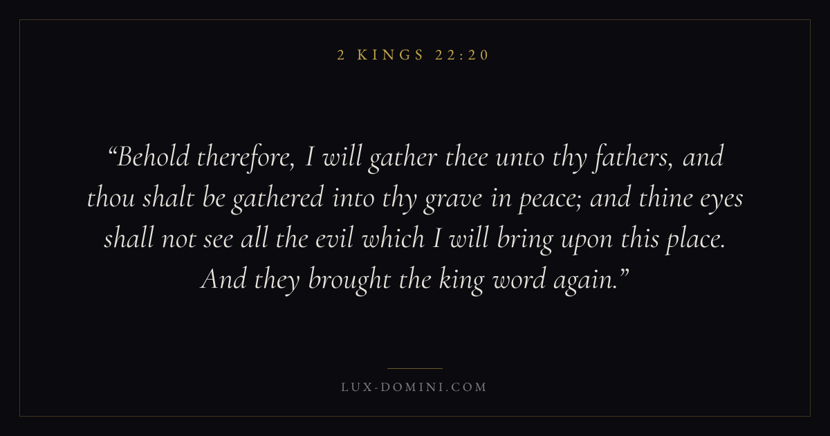 Behold therefore, I will gather thee unto thy fathers, and thou shalt be gathered into thy grave in peace; and thine eyes shall not see all the evil which I will bring upon this place. And they brought the king word again.