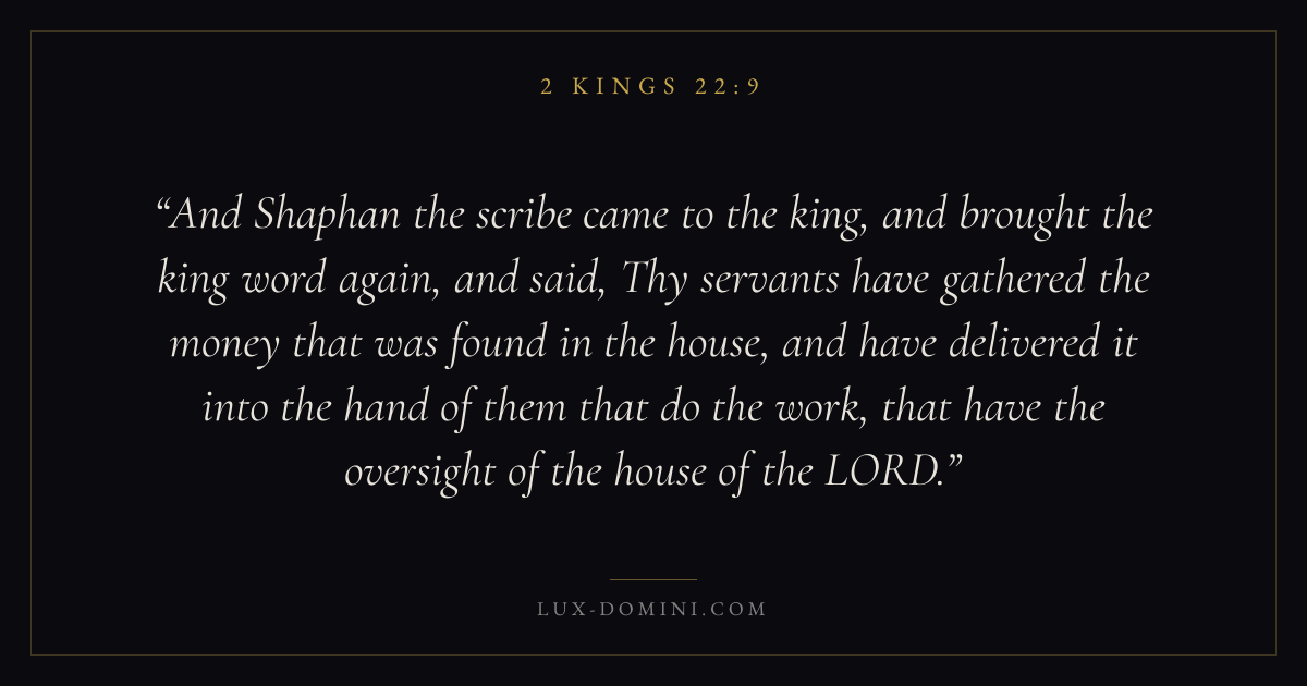 And Shaphan the scribe came to the king, and brought the king word again, and said, Thy servants have gathered the money that was found in the house, and have delivered it into the hand of them that do the work, that have the oversight of the house of the LORD.