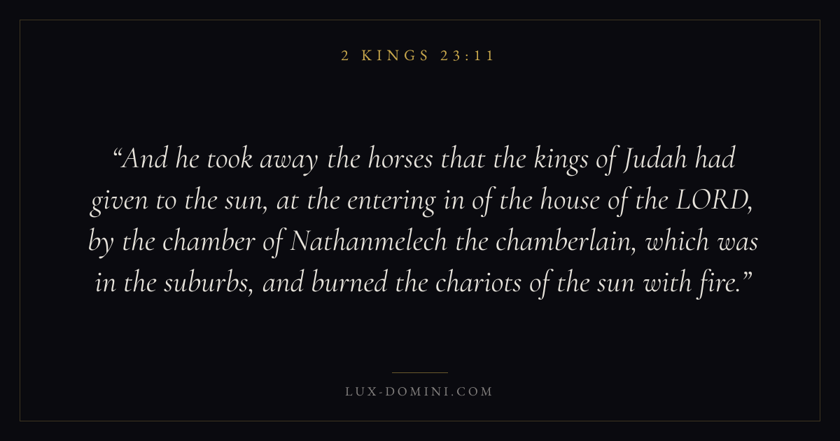 And he took away the horses that the kings of Judah had given to the sun, at the entering in of the house of the LORD, by the chamber of Nathanmelech the chamberlain, which was in the suburbs, and burned the chariots of the sun with fire.