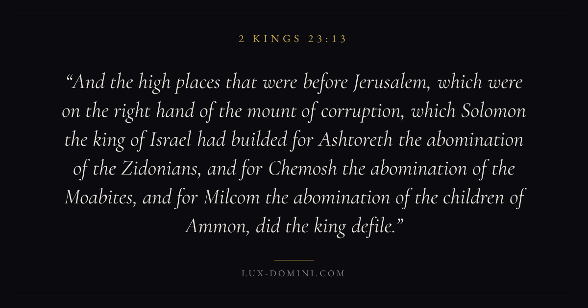 And the high places that were before Jerusalem, which were on the right hand of the mount of corruption, which Solomon the king of Israel had builded for Ashtoreth the abomination of the Zidonians, and for Chemosh the abomination of the Moabites, and for Milcom the abomination of the children of Ammon, did the king defile.