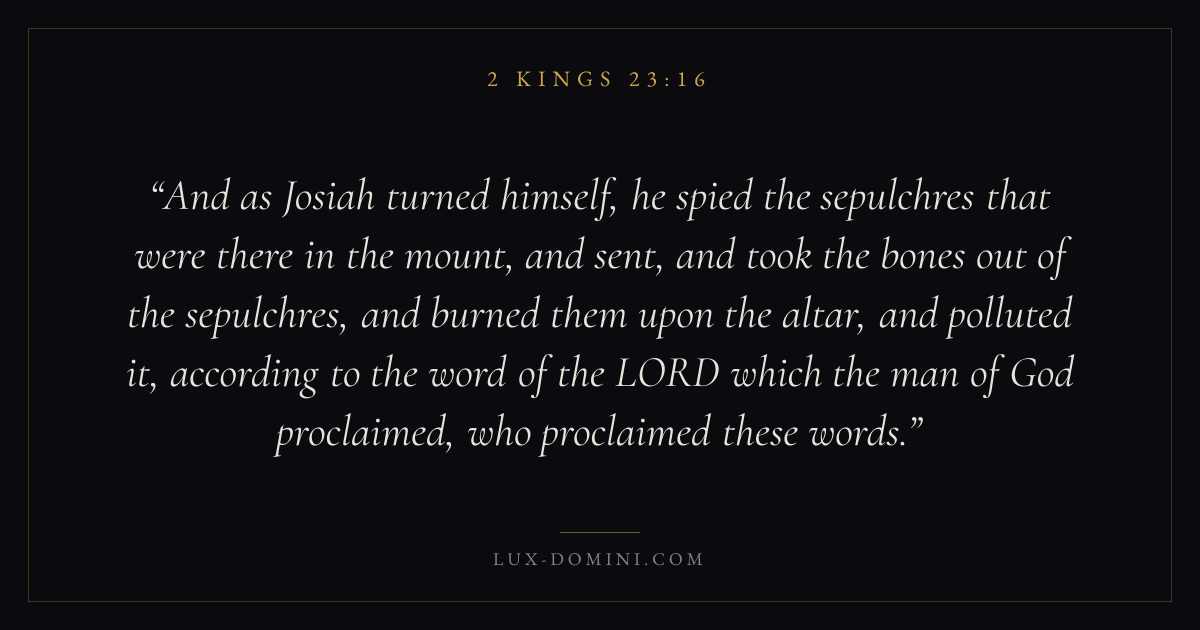 And as Josiah turned himself, he spied the sepulchres that were there in the mount, and sent, and took the bones out of the sepulchres, and burned them upon the altar, and polluted it, according to the word of the LORD which the man of God proclaimed, who proclaimed these words.